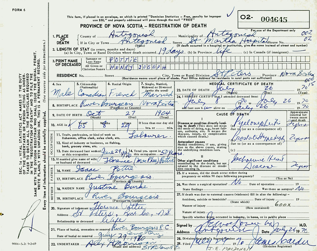 1. PLACE OF DEATH County of Antigonish If in City or Town Antigonish