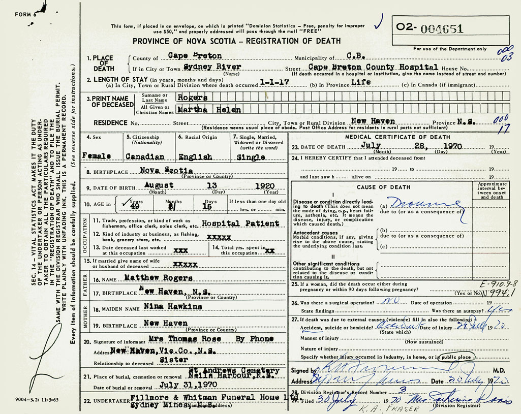 PROVINCE OF NOVA SCOTIA — REGISTRATION OF DEATH