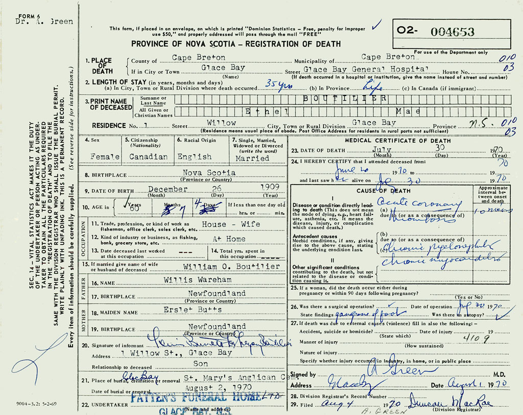1. PLACE OF DEATH County of Cape Breton If in City or Town Glace Bay