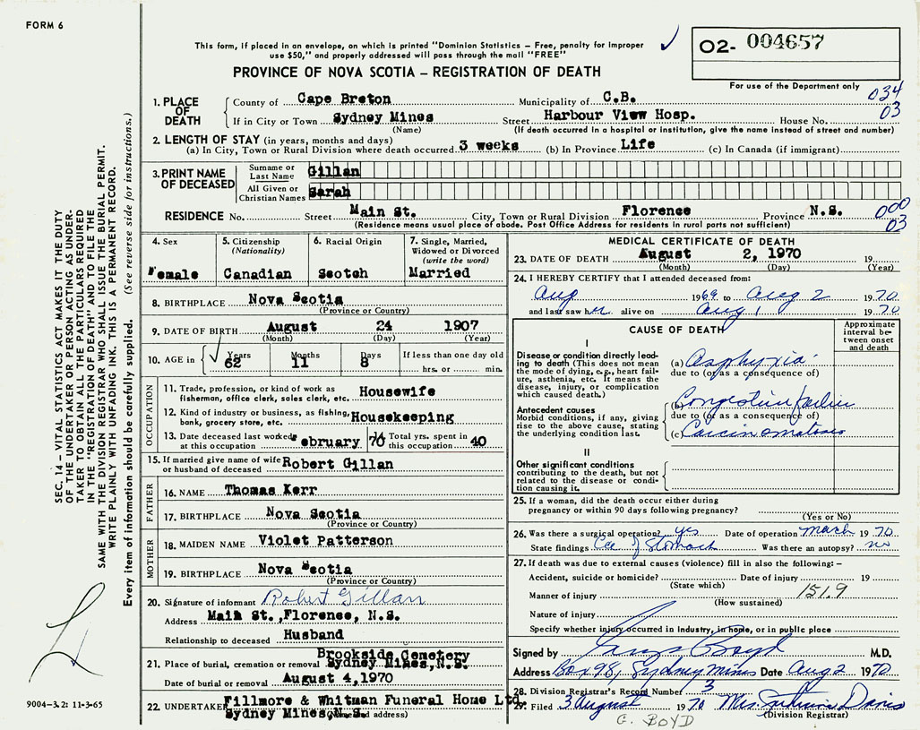 PROVINCE OF NOVA SCOTIA — REGISTRATION OF DEATH