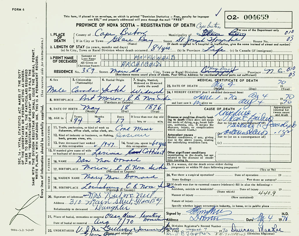 1. PLACE OF DEATH County of Cape Breton If in City or Town Glace Bay