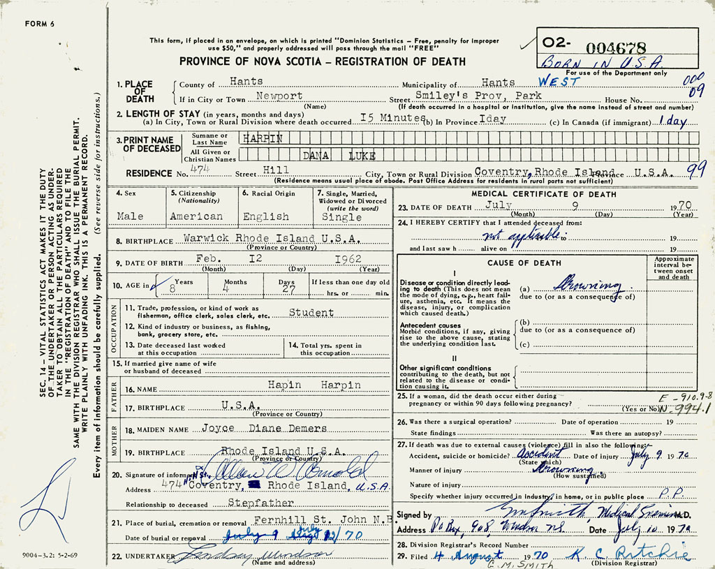 PROVINCE OF NOVA SCOTIA — REGISTRATION OF DEATH