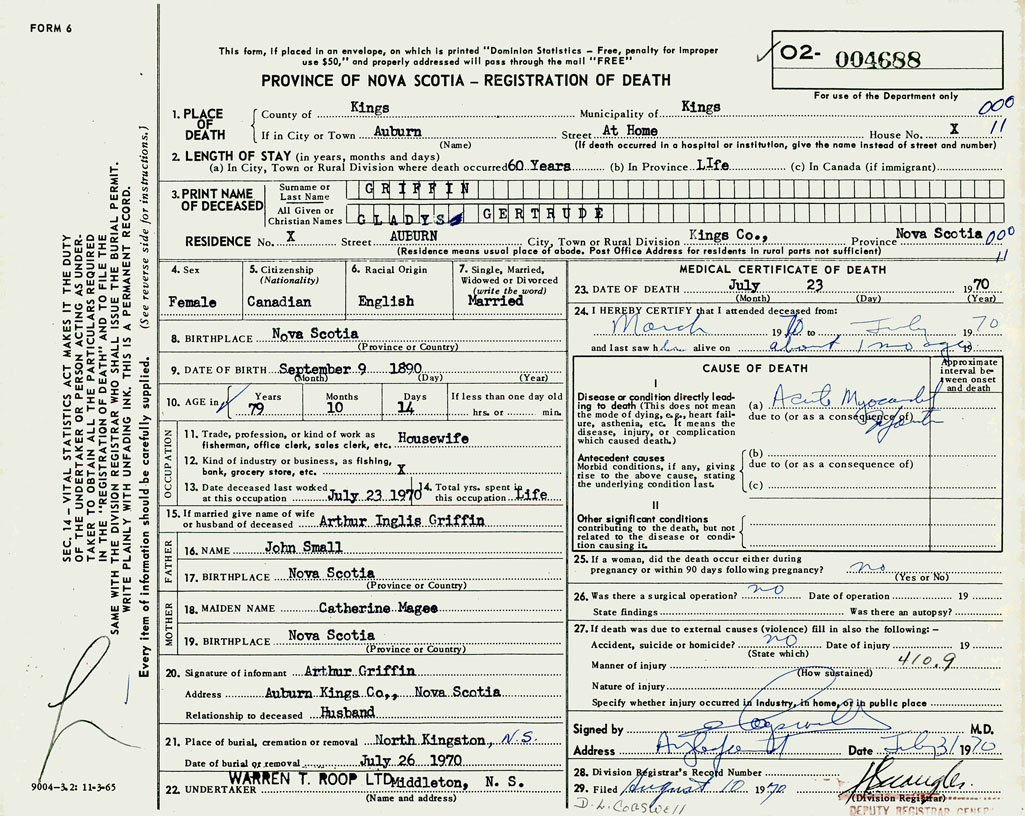 PROVINCE OF NOVA SCOTIA — REGISTRATION OF DEATH