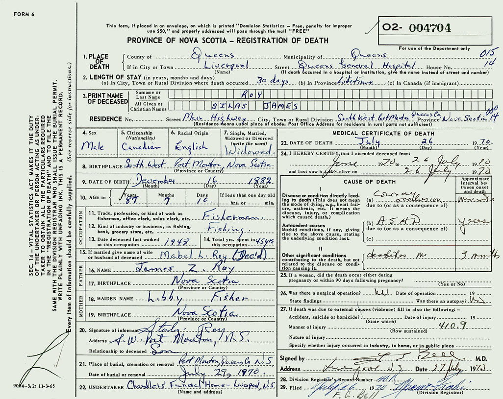 PROVINCE OF NOVA SCOTIA — REGISTRATION OF DEATH