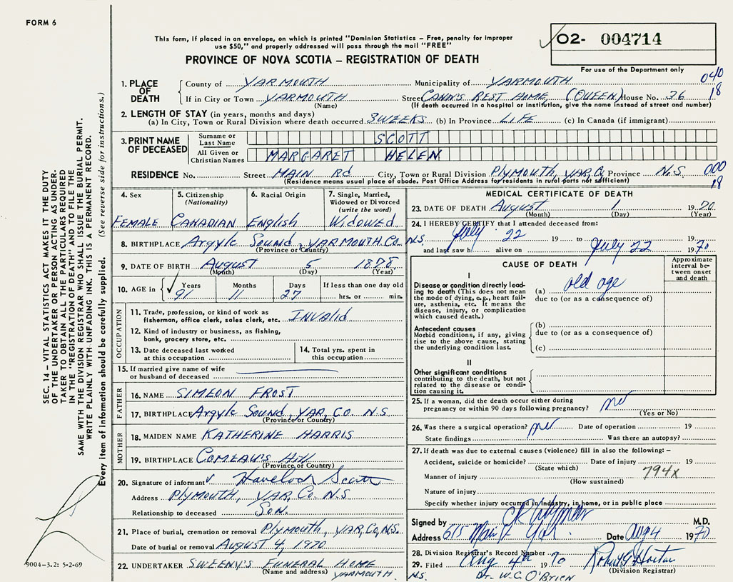 PROVINCE OF NOVA SCOTIA — REGISTRATION OF DEATH