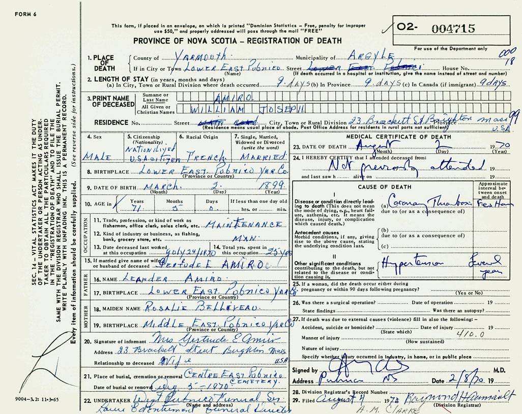 1. PLACE OF DEATH County of Yarmouth If in City or Town Lower East Pubnico