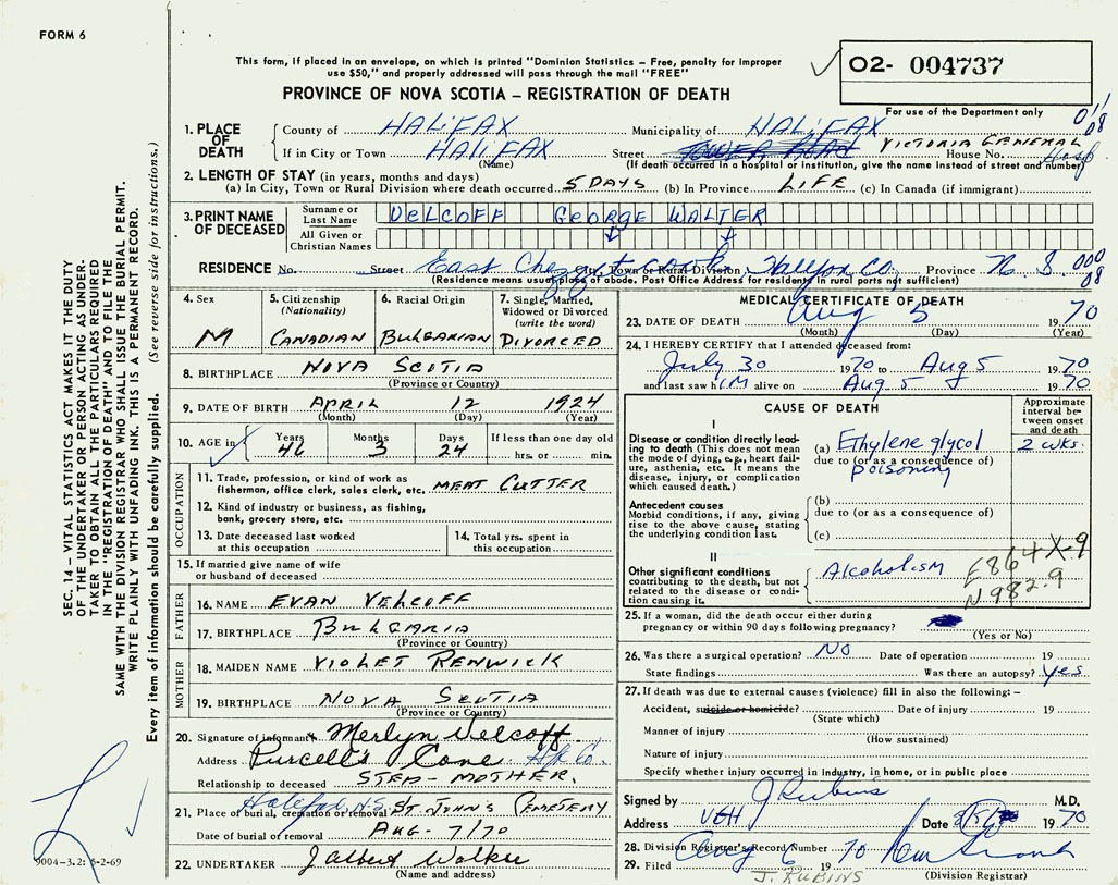 PROVINCE OF NOVA SCOTIA — REGISTRATION OF DEATH