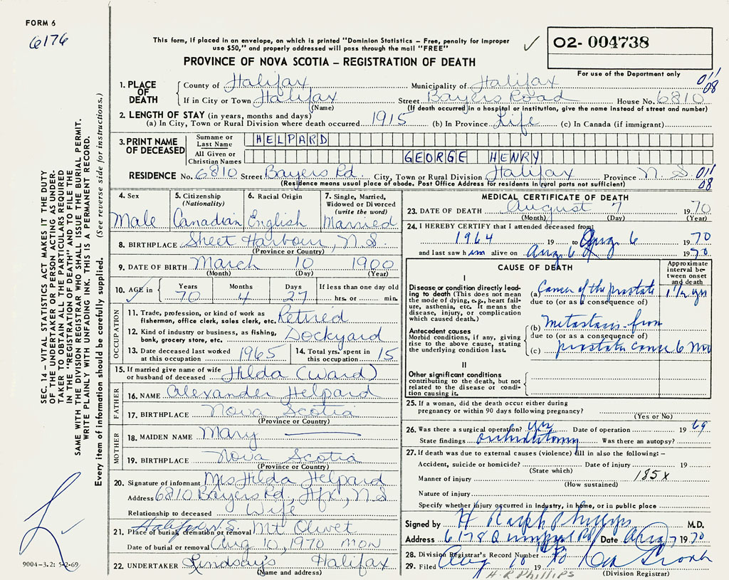 1. PLACE OF DEATH County of Halifax If in City or Town 6810 Bayers Road, Halifax