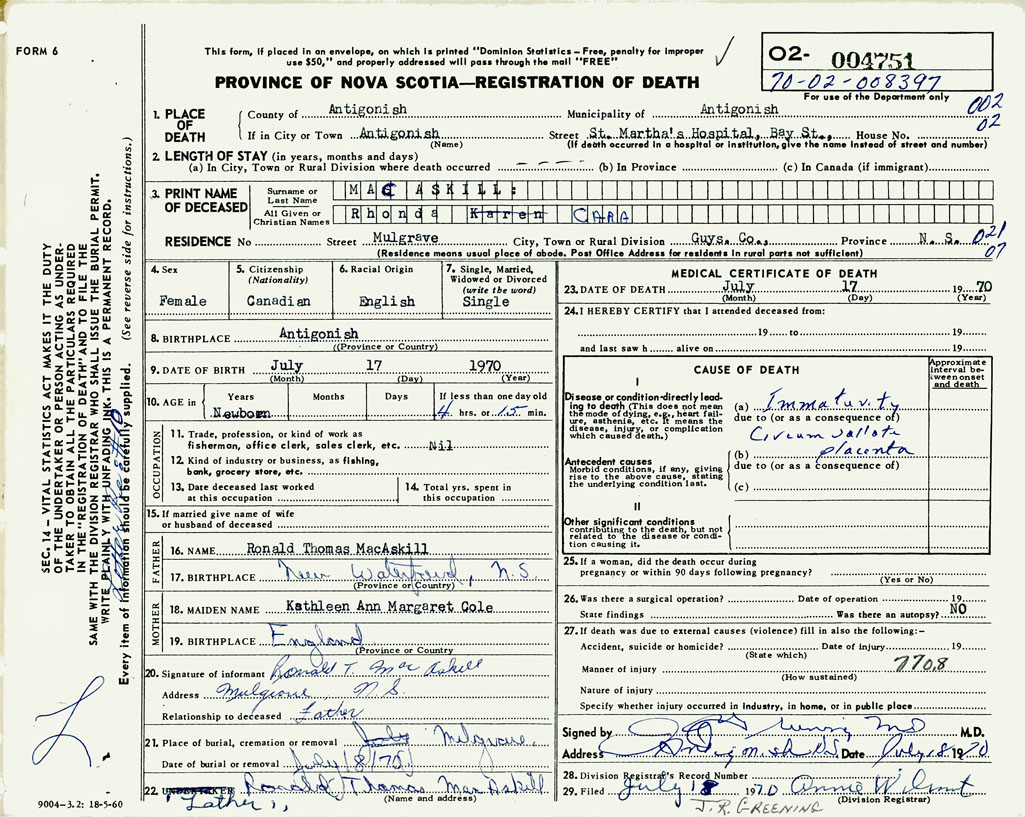PROVINCE OF NOVA SCOTIA — REGISTRATION OF DEATH