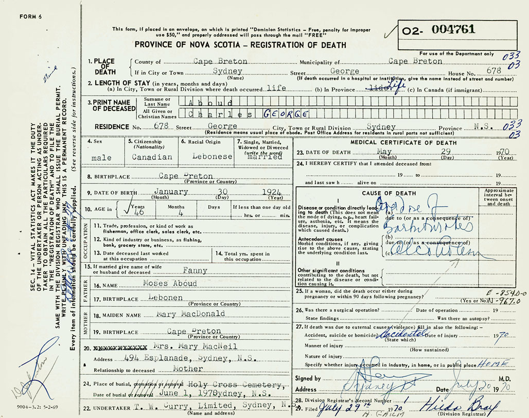 PROVINCE OF NOVA SCOTIA — REGISTRATION OF DEATH