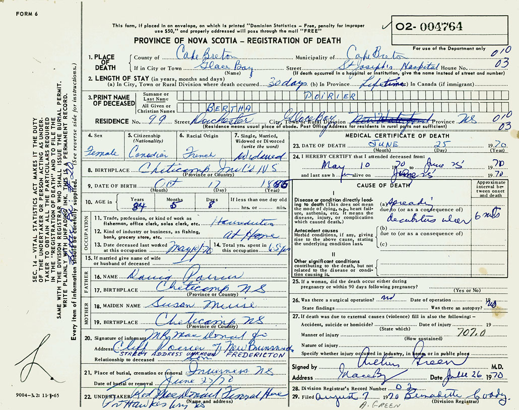 1. PLACE OF DEATH County of Cape Breton If in City or Town Glace Bay