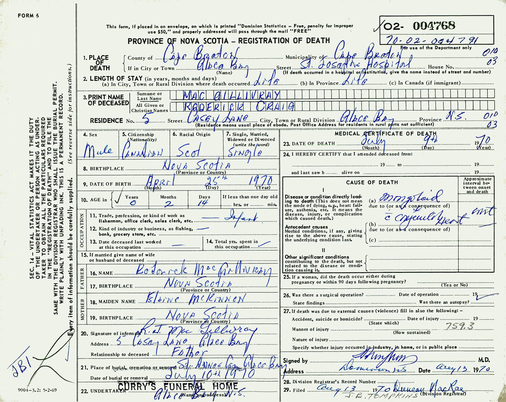 1. PLACE OF DEATH County of Cape If in City or Town Glace Bay