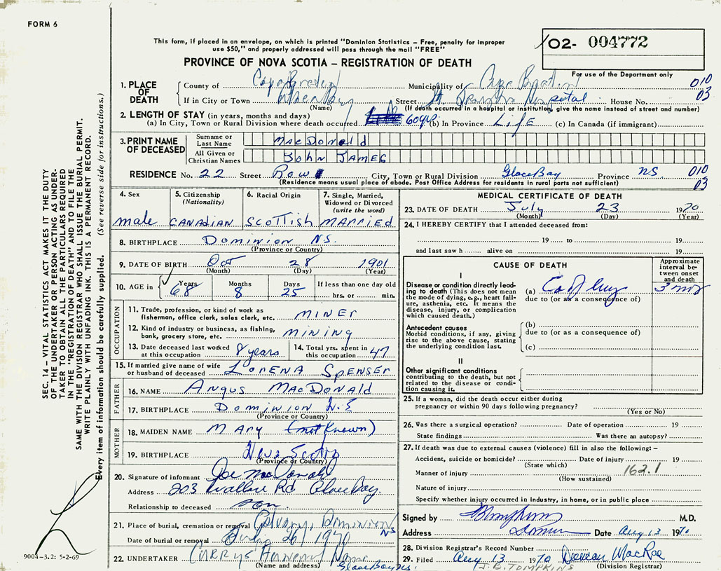 1. PLACE OF DEATH County of Cape Breton If in City or Town Glace Bay