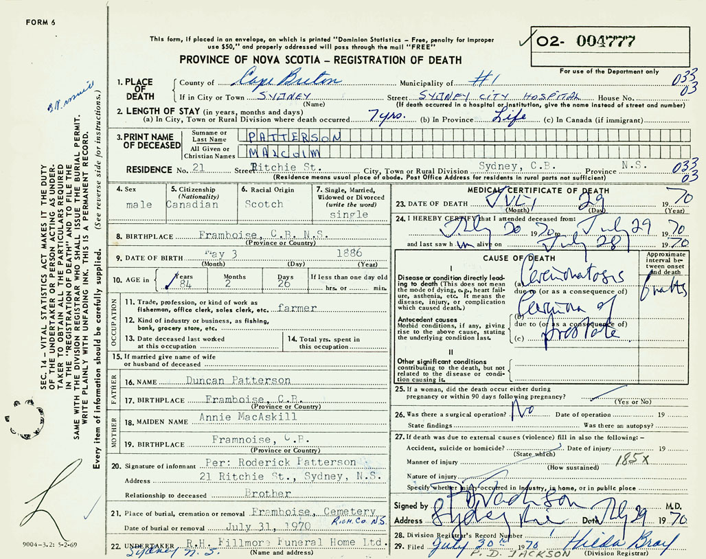 1. PLACE OF DEATH County of Cape Breton If in City or Town Sydney