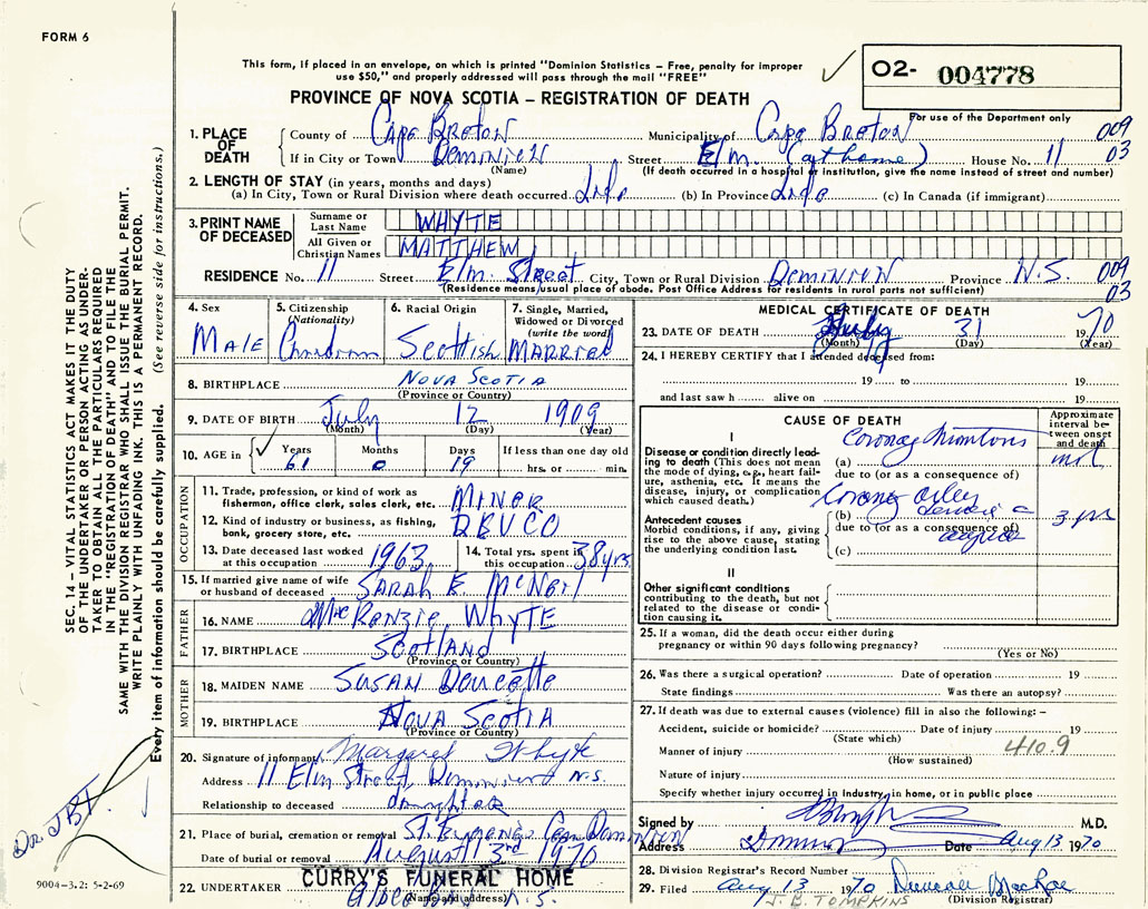 1. PLACE OF DEATH County of Cape Breton If in City or Town Dominion