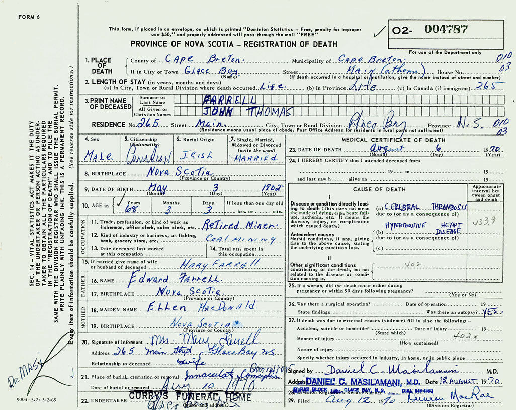 1. PLACE OF DEATH County of Cape Breton If in City or Town Glace Bay