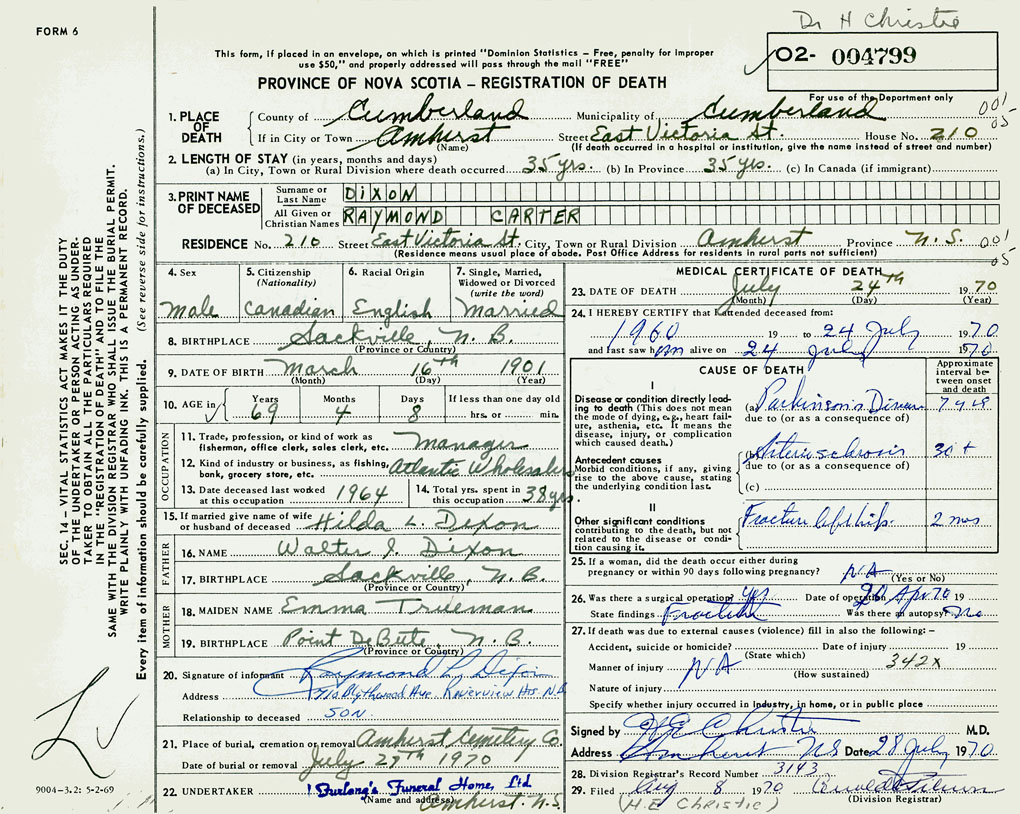 PROVINCE OF NOVA SCOTIA — REGISTRATION OF DEATH