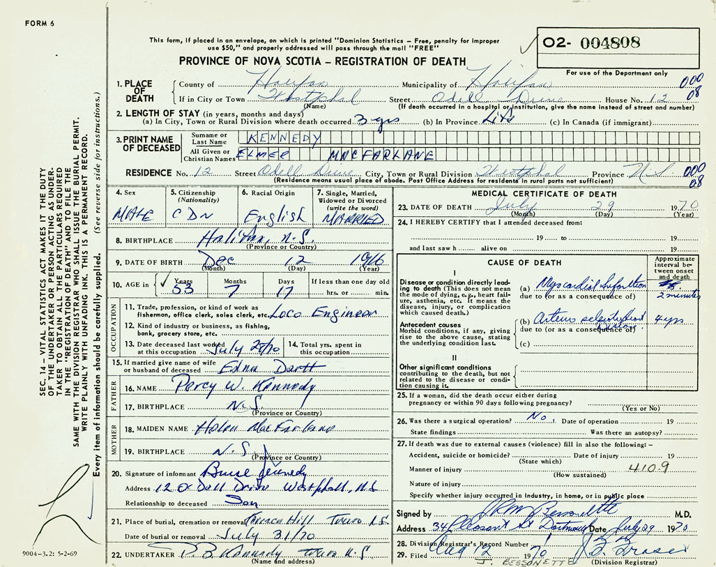 PROVINCE OF NOVA SCOTIA — REGISTRATION OF DEATH