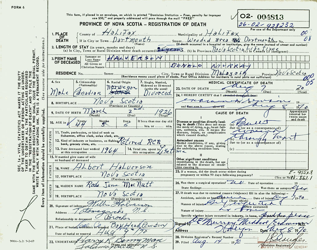 PROVINCE OF NOVA SCOTIA — REGISTRATION OF DEATH