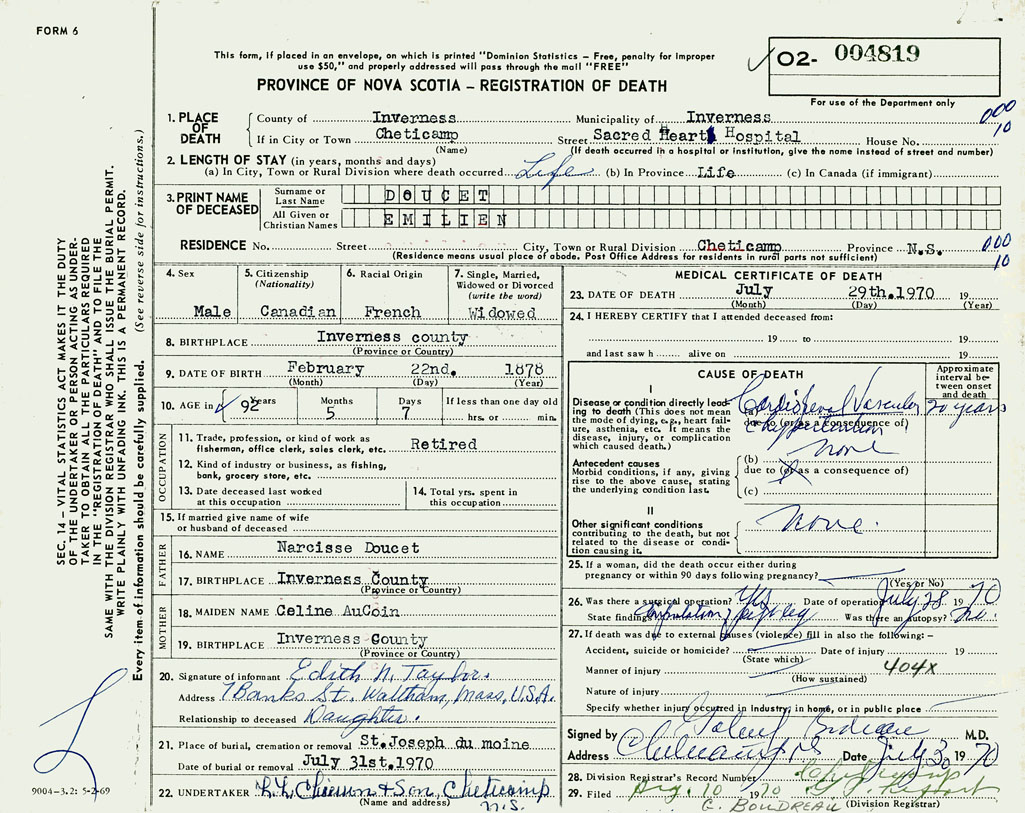 3. PRINT NAME OF DECEASED Doucet, Emilien