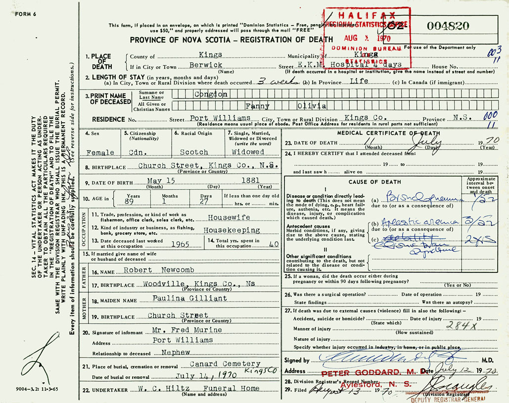 PROVINCE OF NOVA SCOTIA — REGISTRATION OF DEATH
