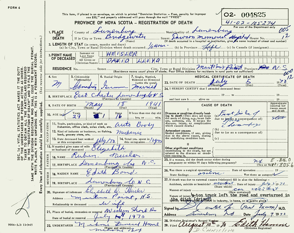 PROVINCE OF NOVA SCOTIA — REGISTRATION OF DEATH