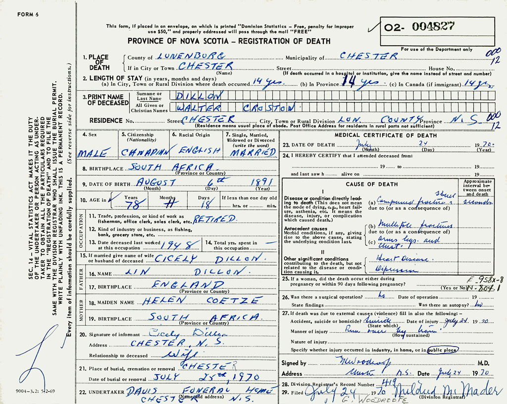 PROVINCE OF NOVA SCOTIA — REGISTRATION OF DEATH
