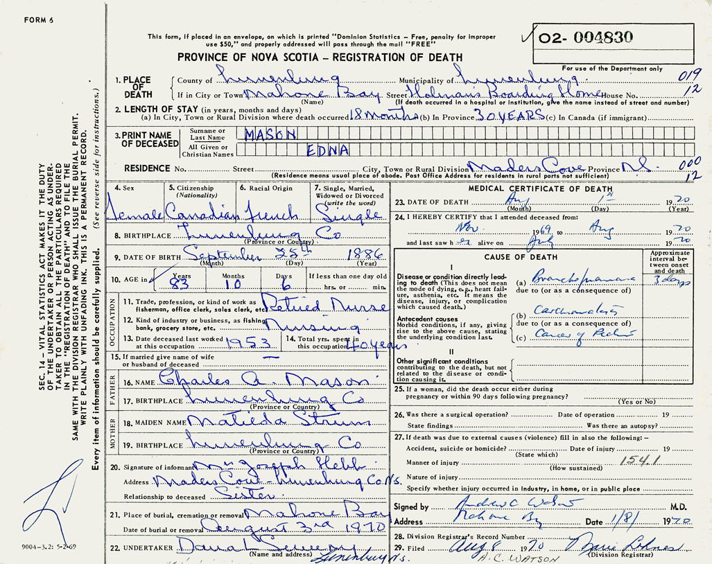 1. PLACE OF DEATH County of Lunenburg If in City or Town Mahone Bay
