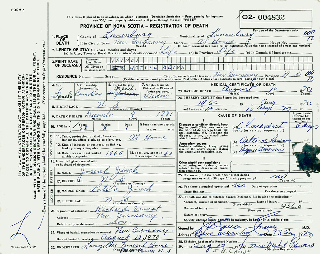 1. PLACE OF DEATH County of Lunenburg If in City or Town New Germany