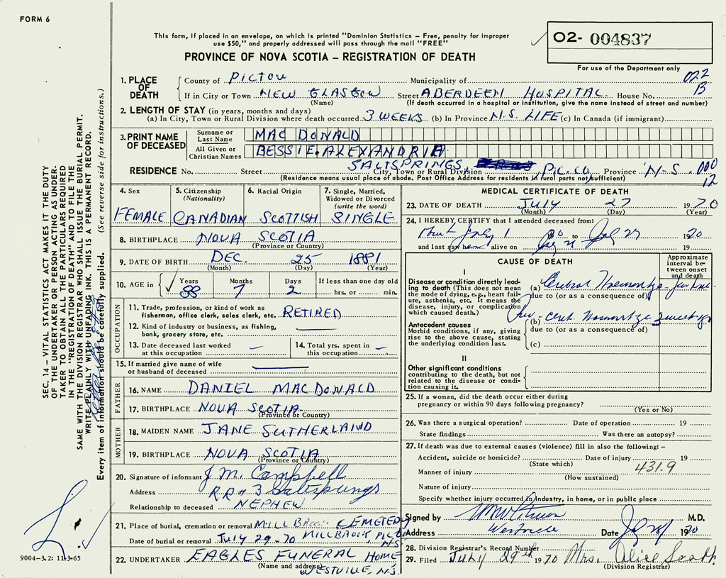 1. PLACE OF DEATH County of Pictou If in City or Town Aberdeen Hospital, New Glasgow