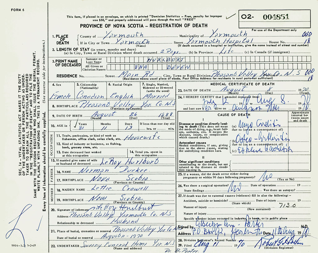 PROVINCE OF NOVA SCOTIA — REGISTRATION OF DEATH