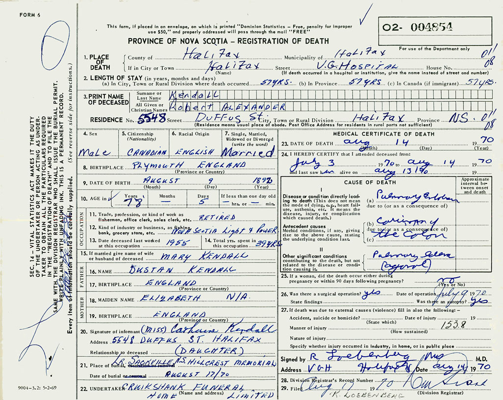 PROVINCE OF NOVA SCOTIA — REGISTRATION OF DEATH