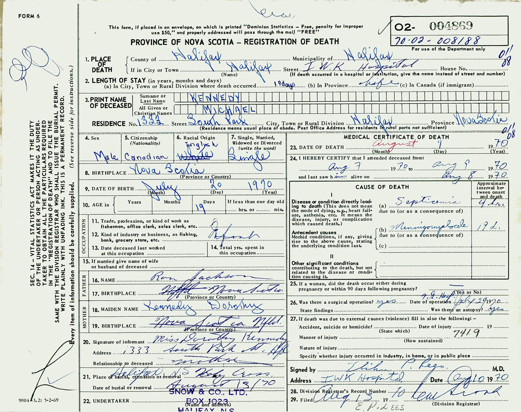 PROVINCE OF NOVA SCOTIA — REGISTRATION OF DEATH