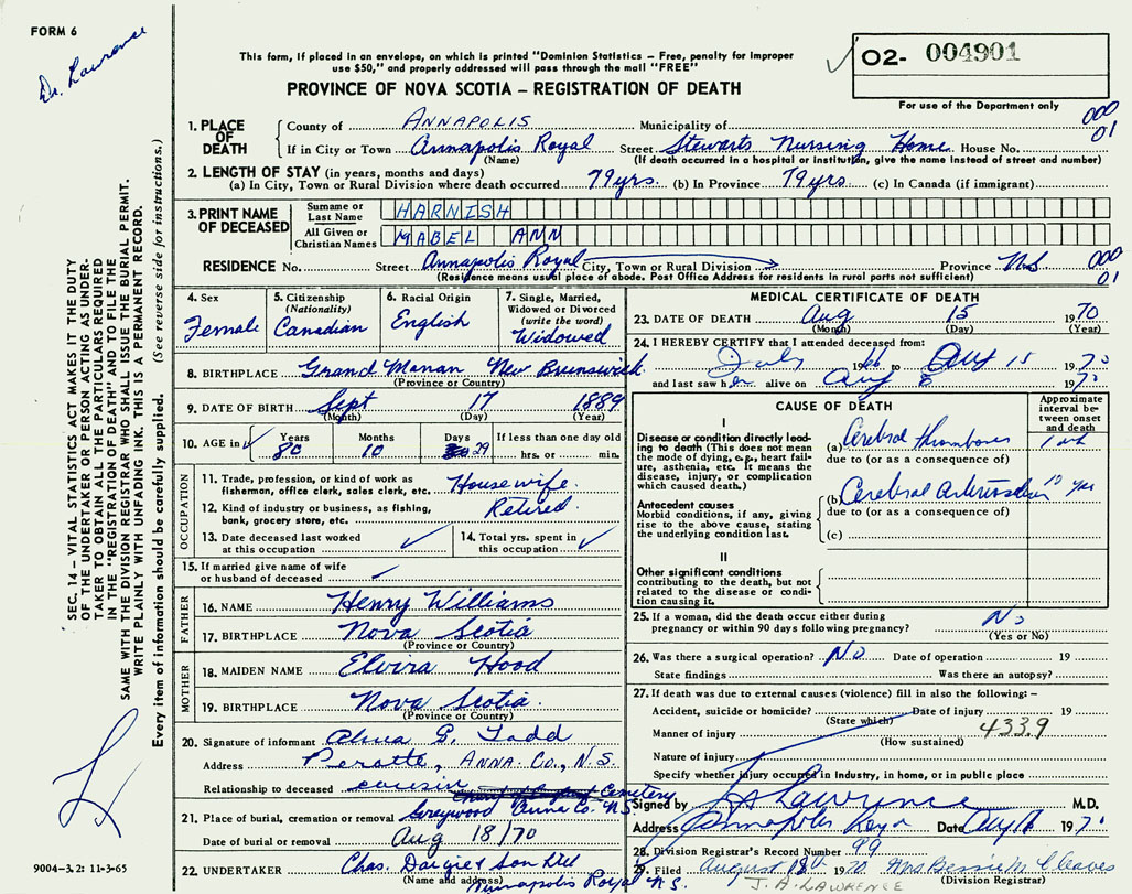 1. PLACE OF DEATH County of Annapolis If in City or Town Annapolis Royal