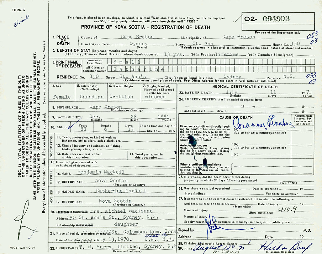 1. PLACE OF DEATH County of Cape Breton If in City or Town Sydney