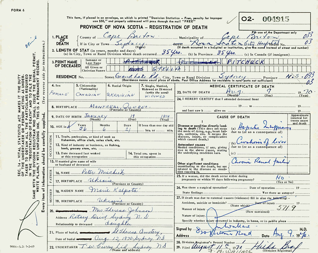 1. PLACE OF DEATH County of Cape Breton If in City or Town Sydney