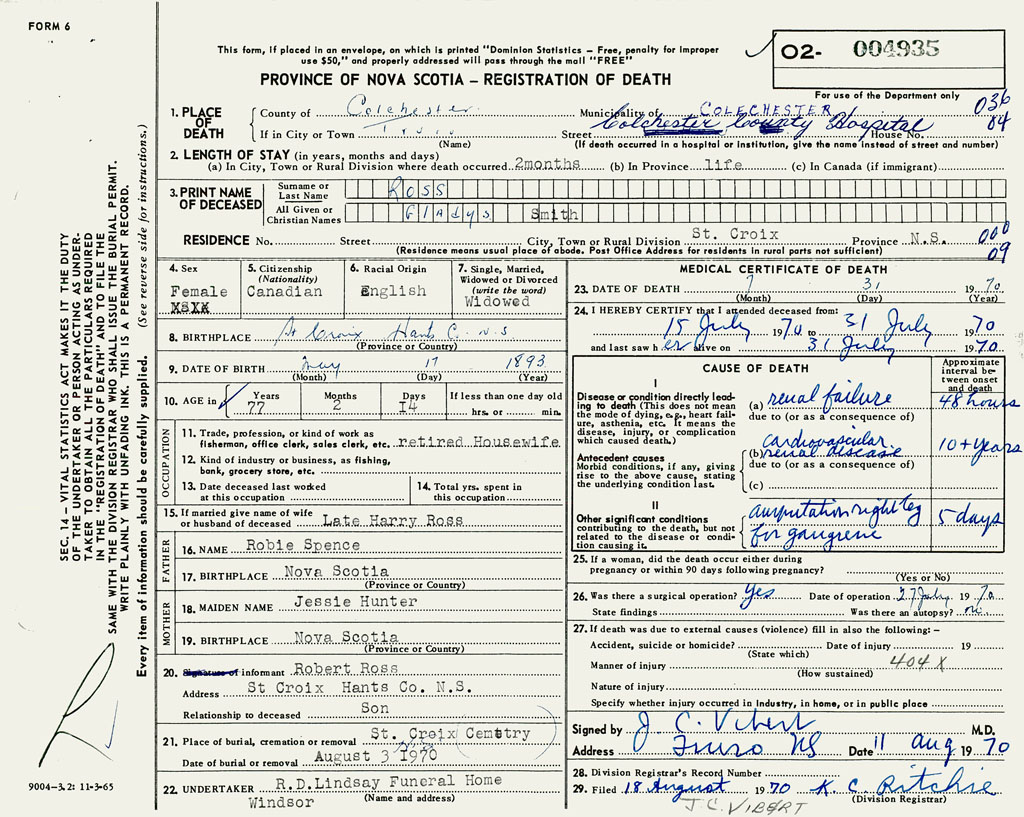 PROVINCE OF NOVA SCOTIA — REGISTRATION OF DEATH