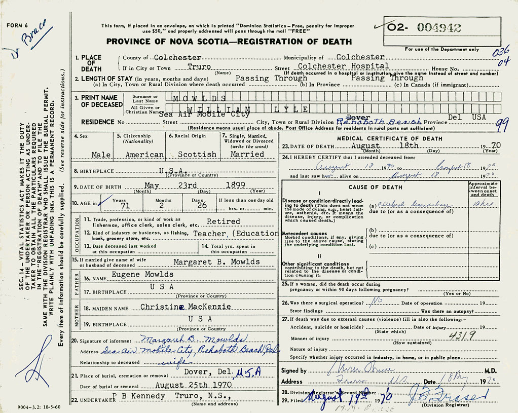 PROVINCE OF NOVA SCOTIA — REGISTRATION OF DEATH