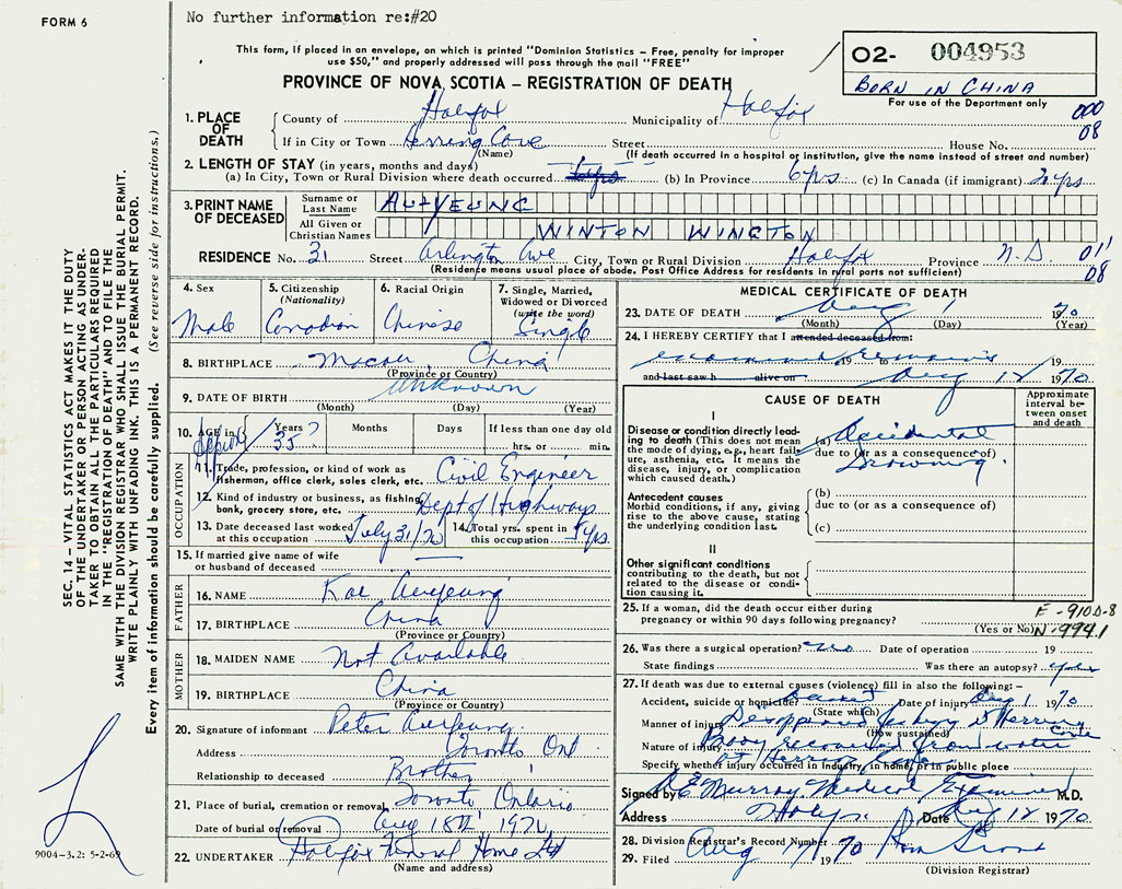 PROVINCE OF NOVA SCOTIA — REGISTRATION OF DEATH