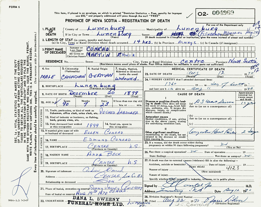 22. Undertaker Dana L. Sweeny Funeral Home Ltd. Lunenburg