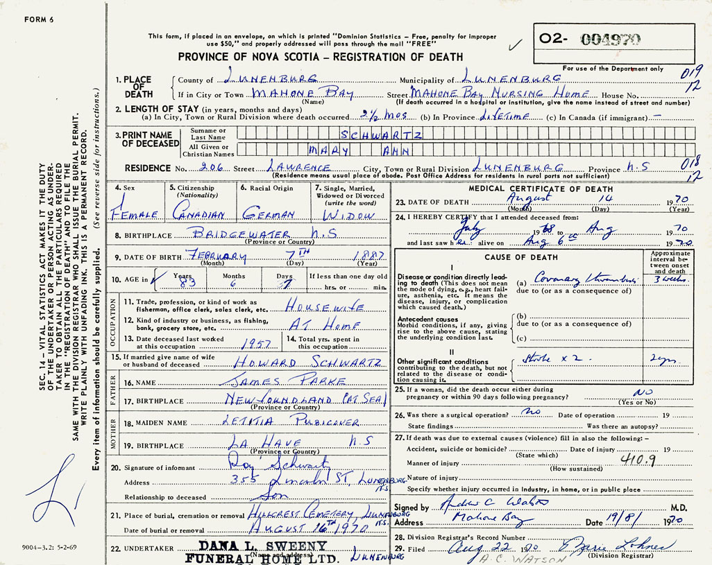 1. PLACE OF DEATH County of Lunenburg If in City or Town Mahone Bay