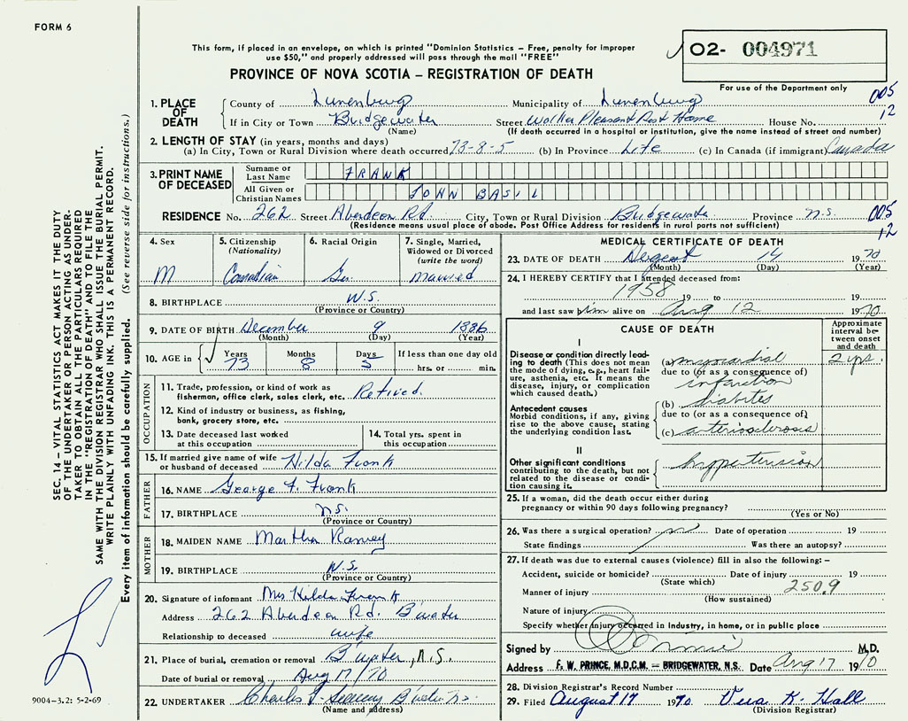 PROVINCE OF NOVA SCOTIA — REGISTRATION OF DEATH