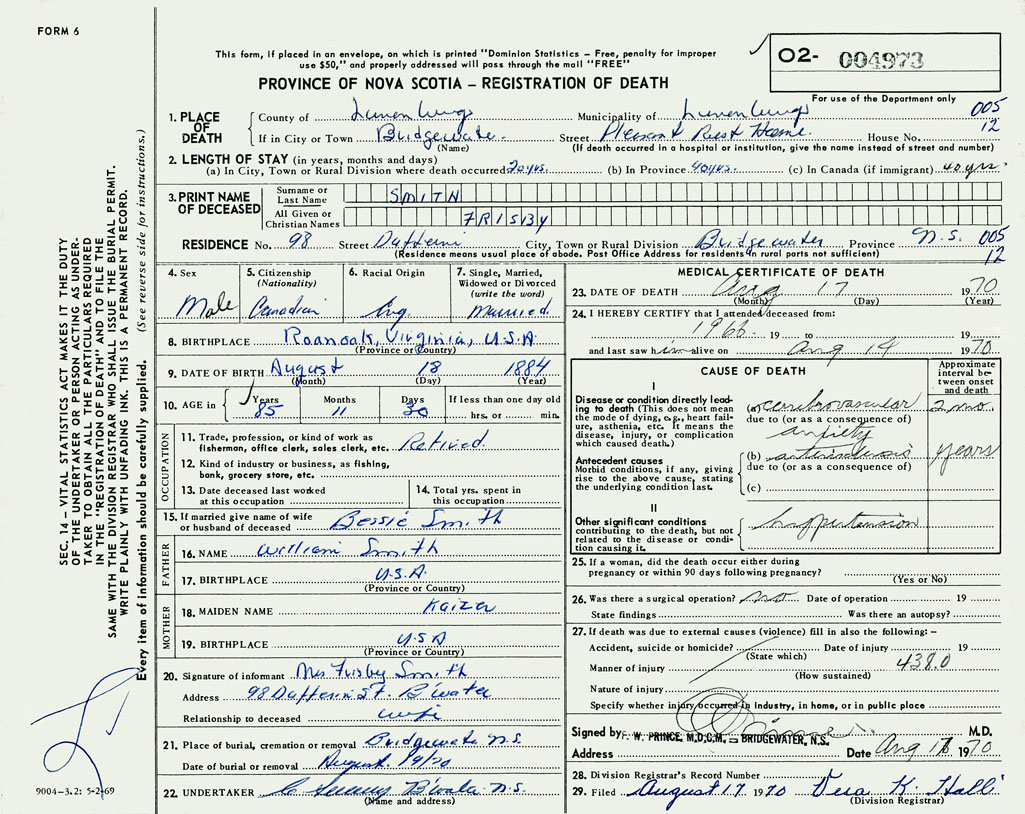 PROVINCE OF NOVA SCOTIA — REGISTRATION OF DEATH