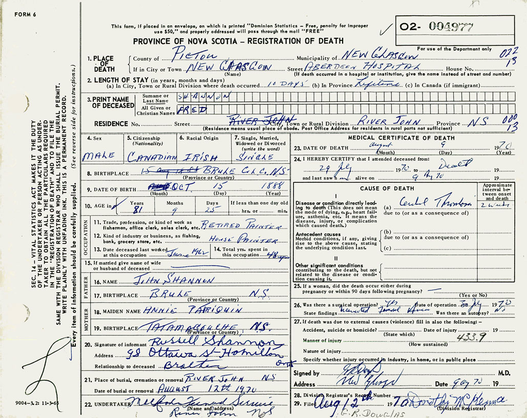 PROVINCE OF NOVA SCOTIA — REGISTRATION OF DEATH