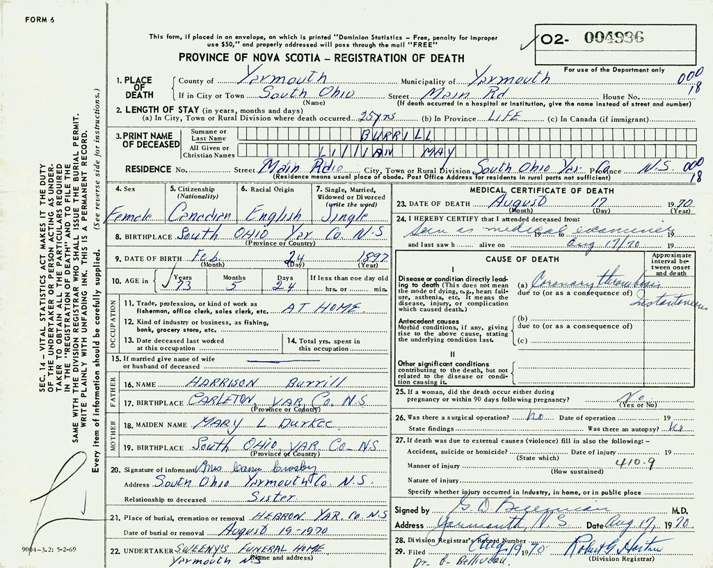 PROVINCE OF NOVA SCOTIA — REGISTRATION OF DEATH