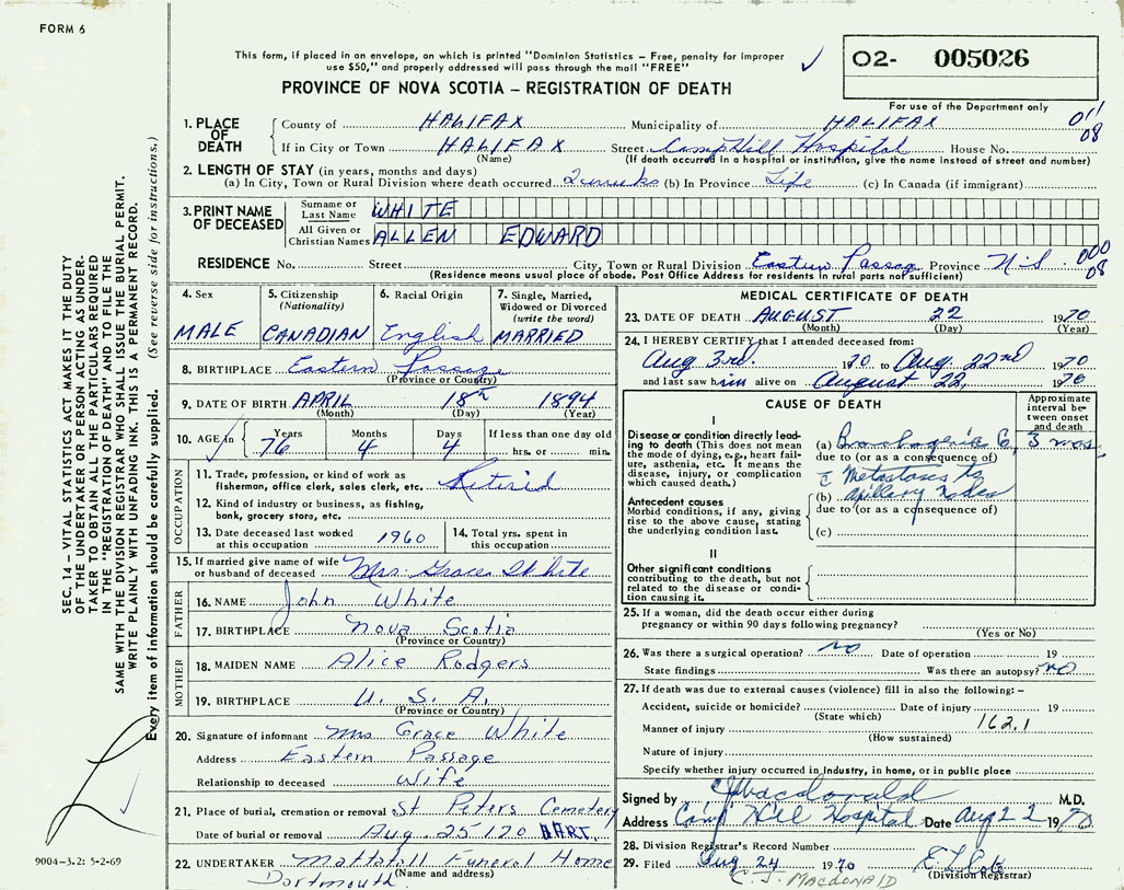 PROVINCE OF NOVA SCOTIA — REGISTRATION OF DEATH