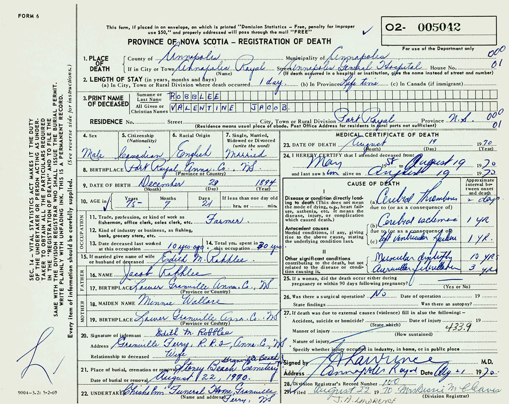 1. PLACE OF DEATH County of Annapolis If in City or Town Annapolis Royal