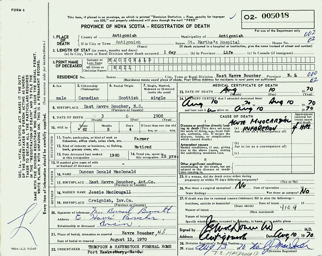PROVINCE OF NOVA SCOTIA — REGISTRATION OF DEATH