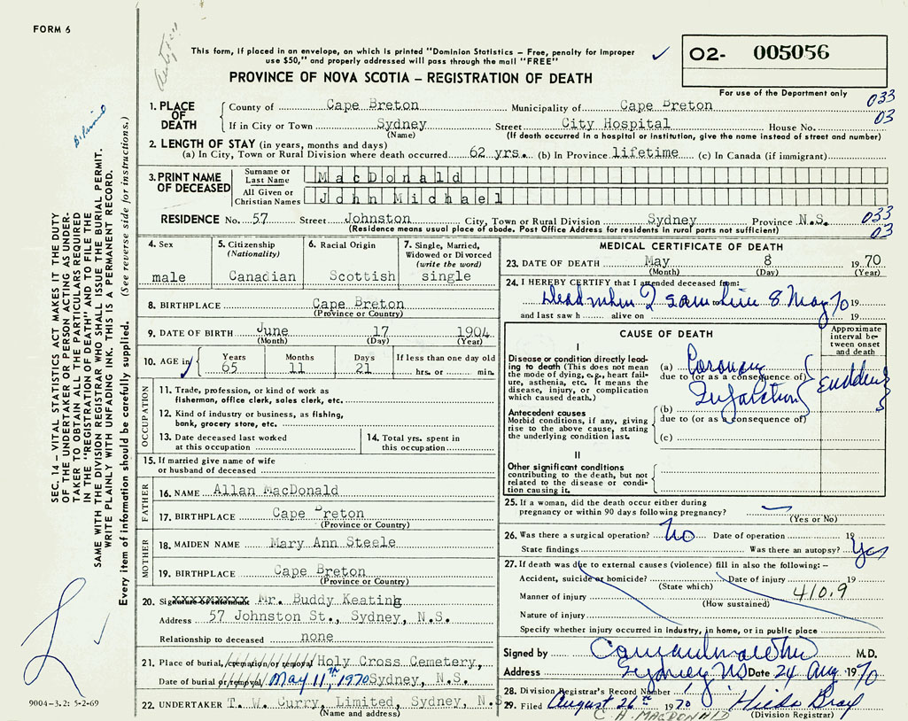 PROVINCE OF NOVA SCOTIA — REGISTRATION OF DEATH