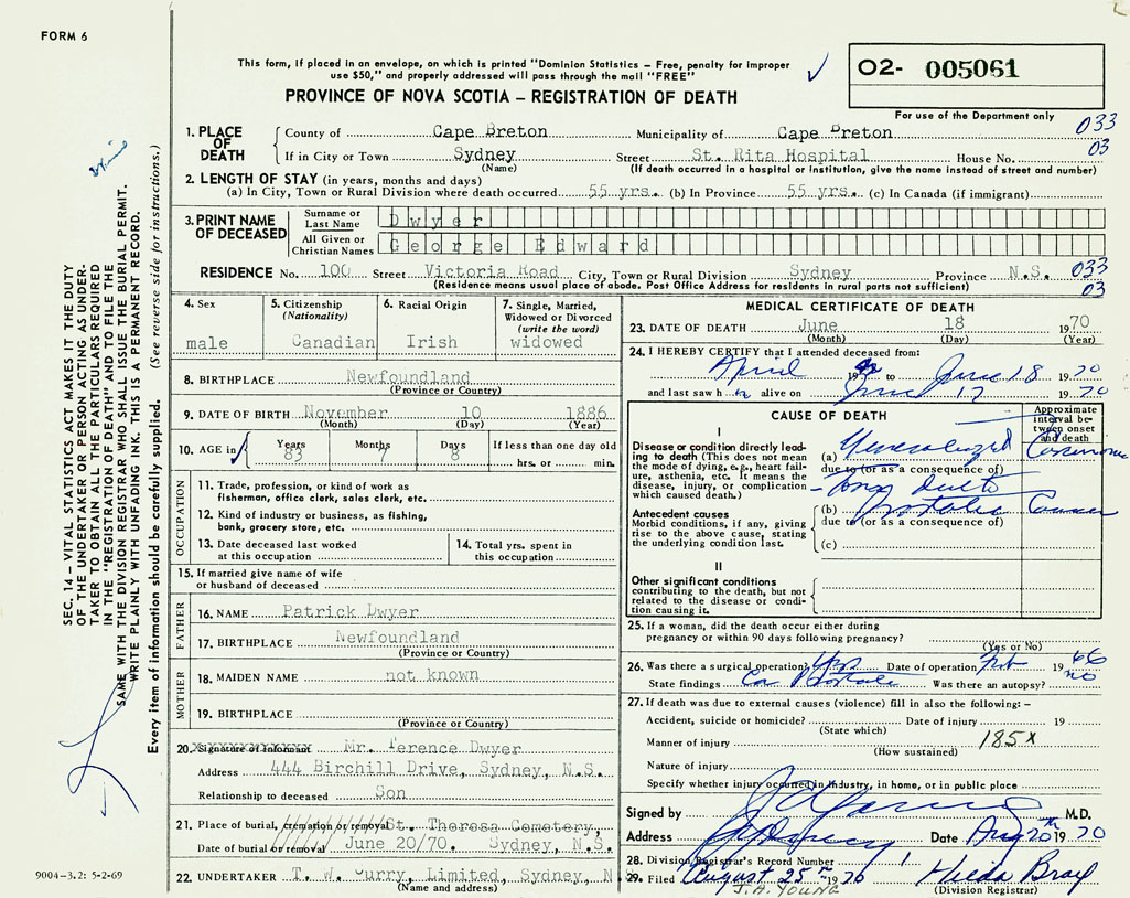 1. PLACE OF DEATH County of Cape Breton If in City or Town Sydney